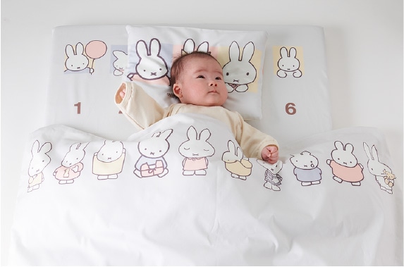 固わた敷きふとん用シーツには1~12の数字がプリントされていて、付帯されたミッフィーの顔型リーフレットを使うことでマンスリーフォト撮影にもお使いいただけます。