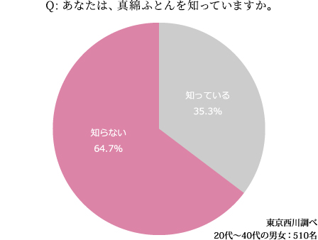 アンケートでも、真綿ふとんを知らないと答えた方は64.7%と、あまり知られていない真綿ふとんですが、羽毛に並ぶ高級掛けふとんとして、今注目を集めているのをご存知ですか?