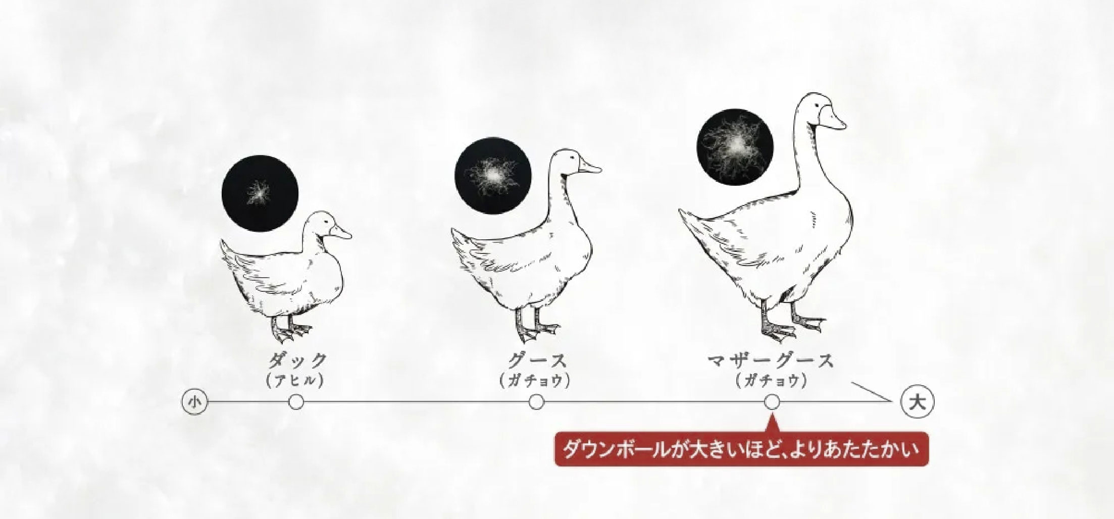 体が大きくなるほどダウンボールが大きくなり、空気を含む量=かさ高があたたかさに影響します。