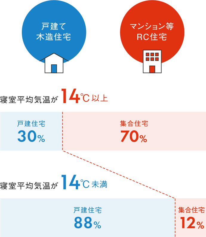 「マンション」等のRC(鉄筋コンクリート)造住宅と、戸建て住宅の室温を比較すると、RC造住の方が木造よりも気密性があり、熱を逃がしにくいという特性があるとされています。また、全国の寝室1年を通して就寝中の寝室の平均室温は14℃であり、その温度を超える日がRC造住宅では70%という調査結果がでています。