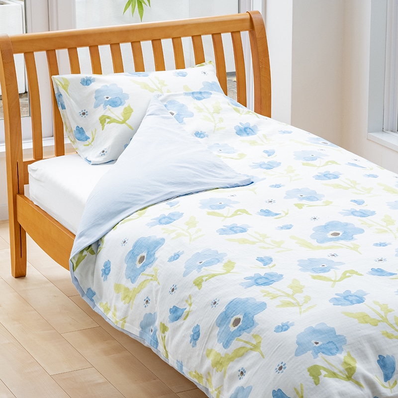 水彩タッチのフラワー柄をあしらった優しいデザインの掛け布団カバーが、寝室で過ごすあなたの時間をより心地よいものへ変えてくれます。