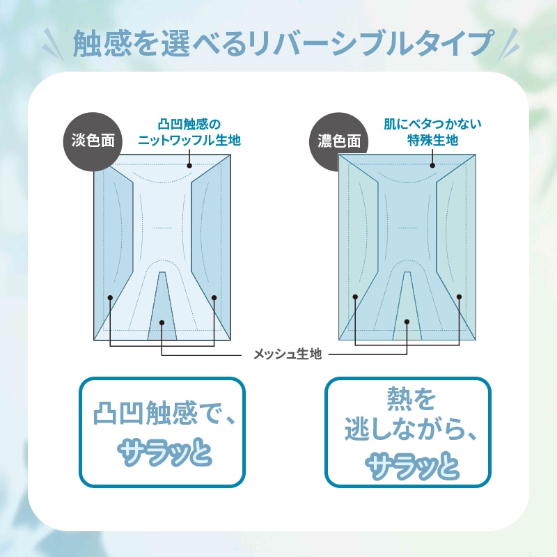 片面はサラッと生地、もう片面には吸水速乾のニットワッフル生地使用。