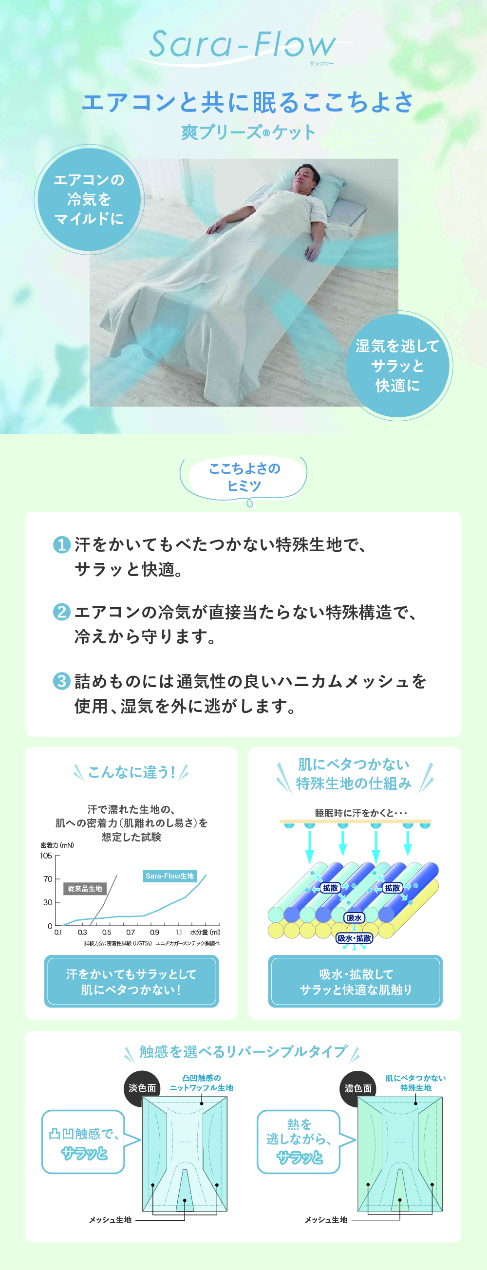 Sara-Flowは、サラッとした肌ざわり、蒸れにくい、軽い、洗濯しやすく干しやすい(早く乾く)など夏の寝具に求める「生活者の声」から生まれたnishikawa(西川)独自のプロダクトです。【サラッと×吸水速乾 2つの素材が気持ちいいケット】