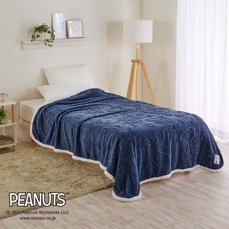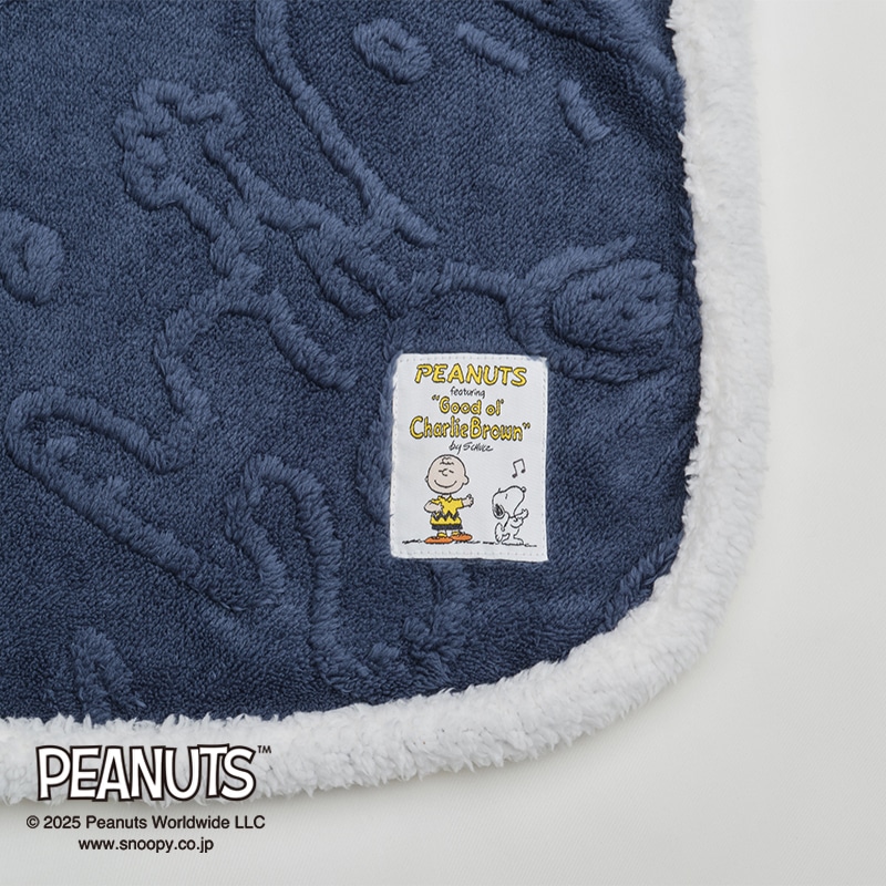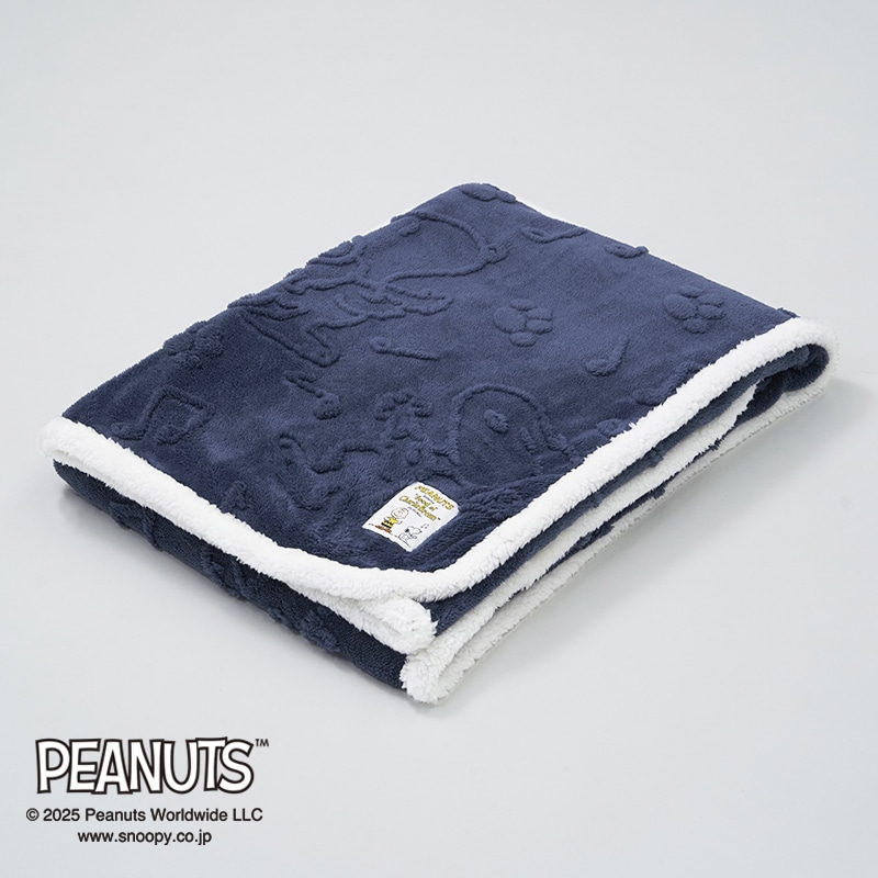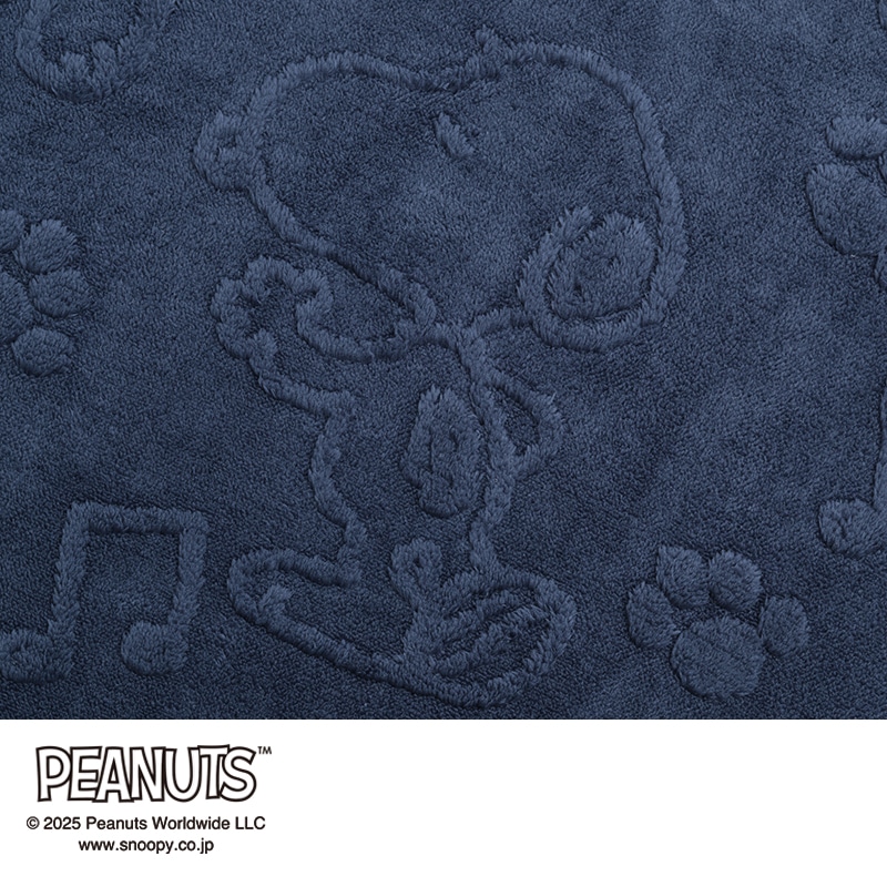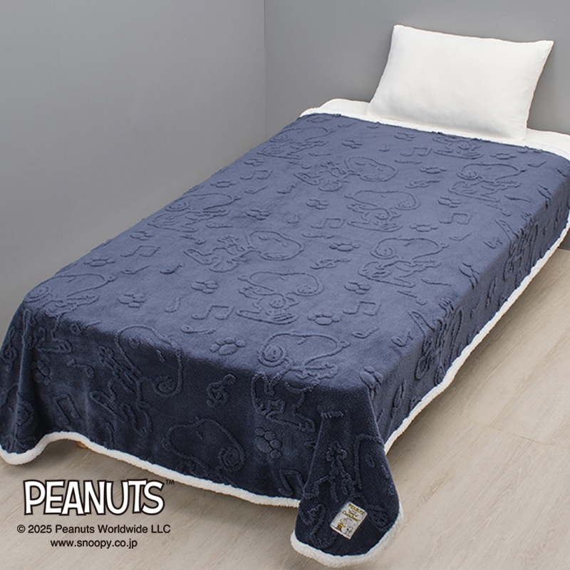 ダンスをするスヌーピーが浮き出た、凹凸感のある楽しいデザインのブランケット。