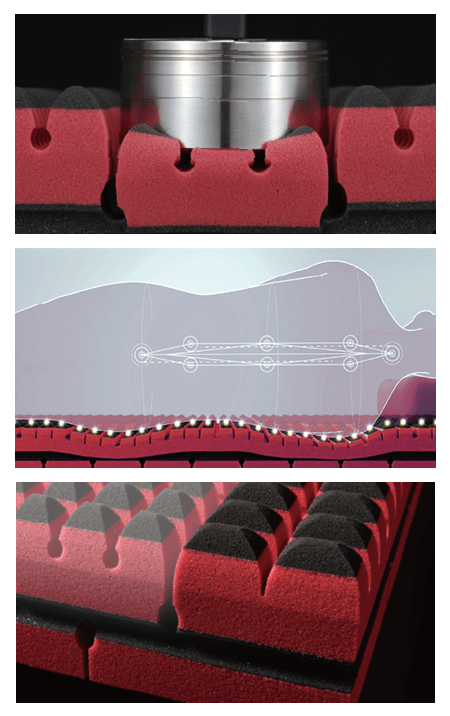 しなやかな新素材「フレスフォーム」をトップ層に採用。表面の1680個の点が体を受け止め体圧を分散。血行をさまたげにくく、圧迫感を緩和します。新たな「サスペンションスリット」との相乗効果で、やさしい触感のより体にフィットする寝心地に。