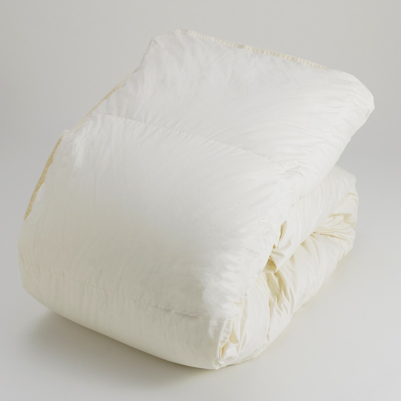 羽毛合掛けふとんは、日によって寒暖差が激しいときや、朝晩はひんやりする季節の変わり目にちょうどよい、やや厚めの羽毛ふとんです。