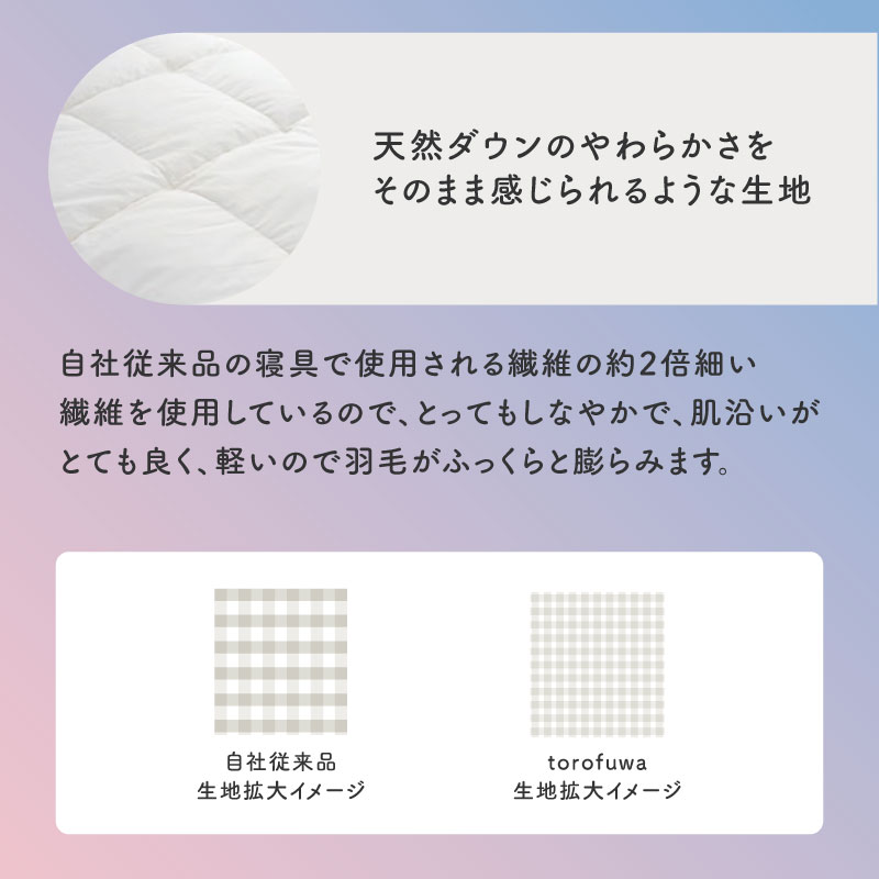 とろとろ肌ざわりの生地には、nishikawa(西川)従来品の寝具で使用される繊維の約2倍細い繊維を使用しています。