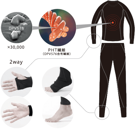 独自素材「DPV576」を練り込んだPHT繊維に期待できる遠赤外線の血行促進効果。