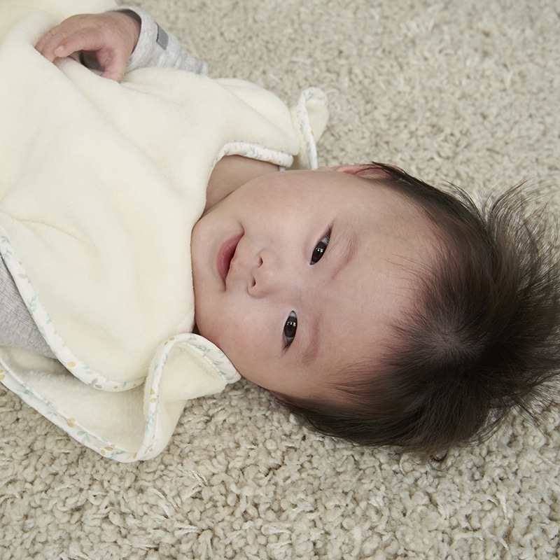 天然素材ならではのやさしい肌ざわりでオールシーズン使用可能です。シンプルな綿毛布素材にプリントヘムがアクセント。ナチュラルなユニセックスデザインです。