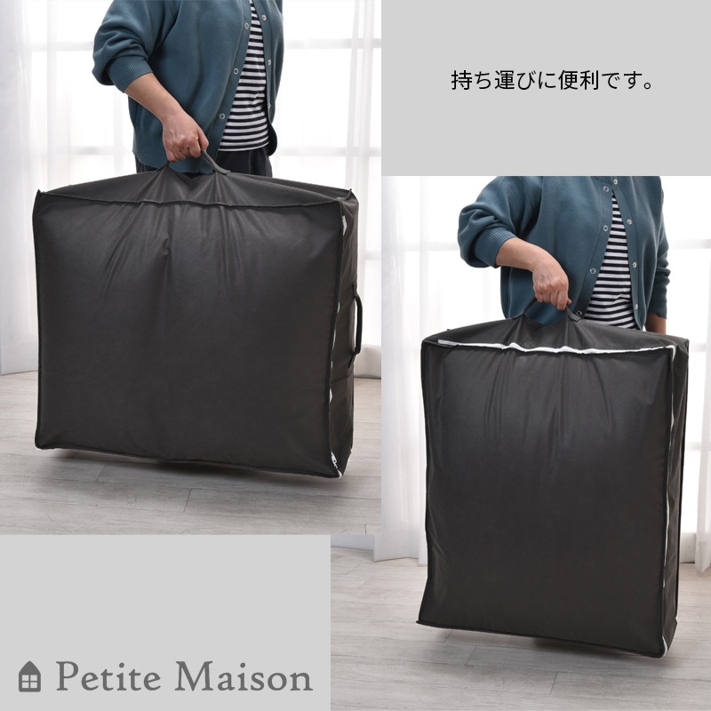 コの字型のファスナーで入れやすく、持ち手が2ヶ所ついていて持ち運びに便利。タテヨコ自在に保管が可能です。