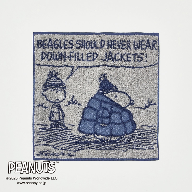 ダウンジャケットを着こんだスヌーピーをジャカード織で表現。